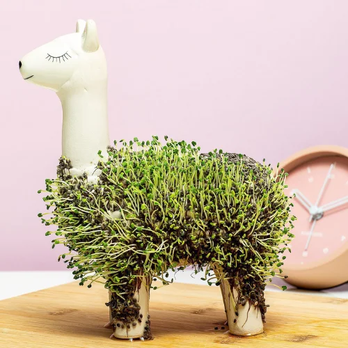 Deze charmante lama bloempot brengt leven en plezier op een unieke manier samen. Hij laat langzaam frisse groene chia “vacht” groeien, wat het zowel decoratief als interactief maakt. Een perfecte kleine verrassing die vreugde toevoegt aan elke ruimte, vooral als Moederdagcadeau.